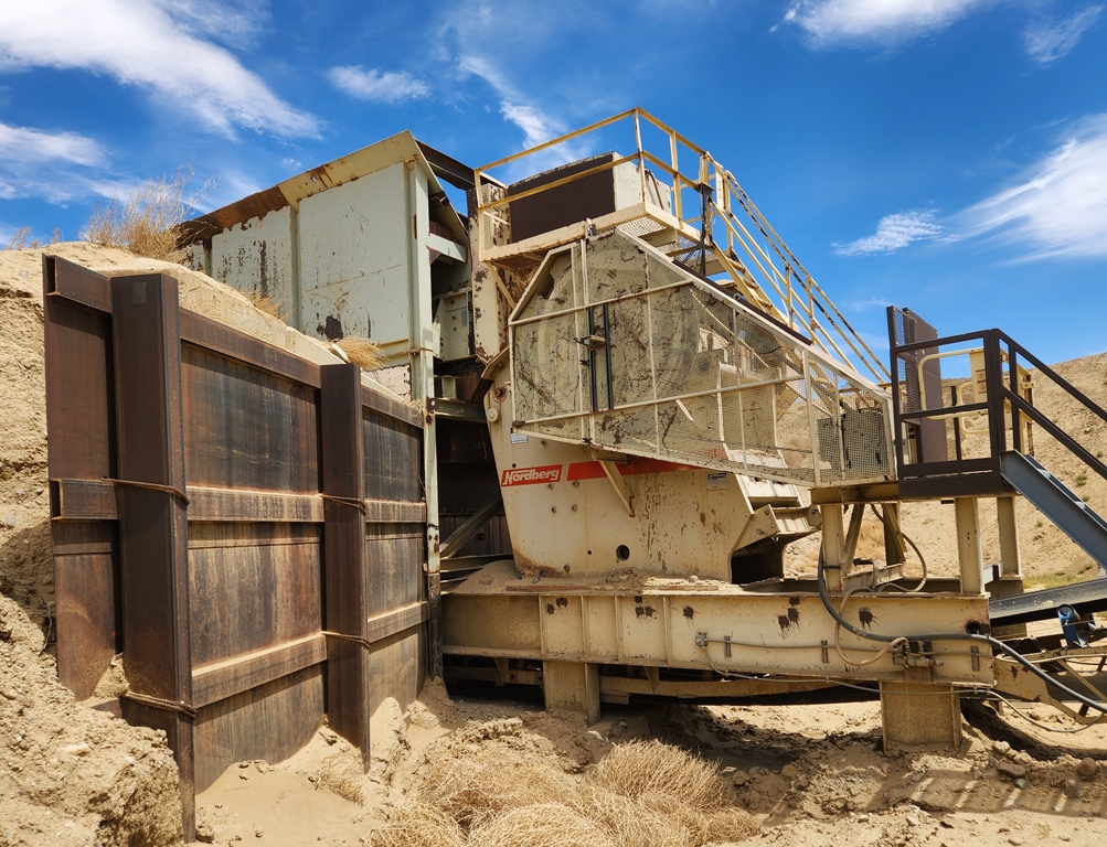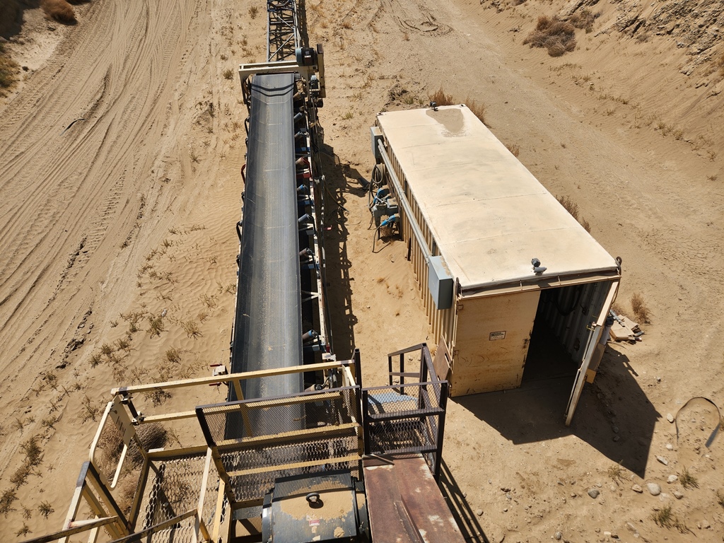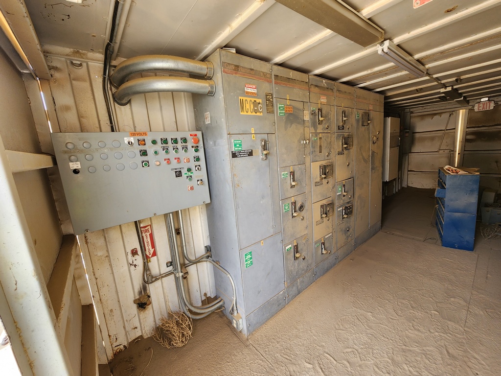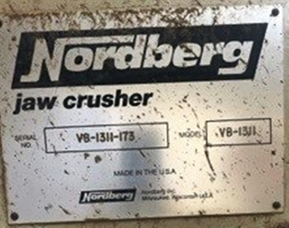 METSO-Nordberg 43” x 52” Primary Jaw Crushing Plant 250 h.p. electric crusher motor, V-belt drive with guard, grease lubricated crusher bearings, 12’ wide x 22’ long 1” steel plate feed hopper with bolt on ¾” steel liners, Telsmith 60” wide x 22’ long vibrating grizzly feeder with solid impact deck and two stage stepped 48” long fines bypass sections with Grizzly Spring Fingers, 75 h.p. variable speed electric motor, V-belt drive, Type 280HF two shaft-four bearing flow-thru oil bath vibrator assembly, fines bypass chute under grizzly springs to conveyor, 48” wide x 60’ long under crusher discharge conveyor with 25 h.p. electric motor, V-belt drive & Dodge #6 shaft mounted gear reduction box. Crusher & conveyor mounted on steel fabricated stationary support structure. Feeder mounted on separate skid base structure with steel bulkheads on three sides sectioned into three level bolt together sections totaling 24’ overall feed height. Electric Motor Control Center mounted in a 8’ wide x 35’ long steel Conex container with main disconnect, soft start for crusher motor, variable speed controller for feeder motor, magnetic starter for conveyor, all pre-wired to exterior wall mounted plug-in disconnects with SO cords to electric motors. Feeder Model C-18012, S/N 323M2045H; Date of Mfr. 1991. Crusher Model VB-1311, S/N VB-1311-173, Date of Mfr.1990. Crusher only production capacity: 300 to 365 tph set at 4½” minimum closed side setting; 465 to 555 tph set at 7”; 590 to 695 tph set at 9”. These production numbers do not include the bypassed fines through grizzly. Total throughput production 750 to 900 tph depending on feed gradations and conditions.