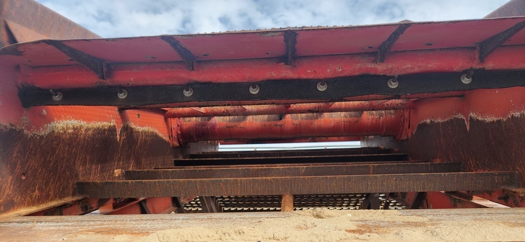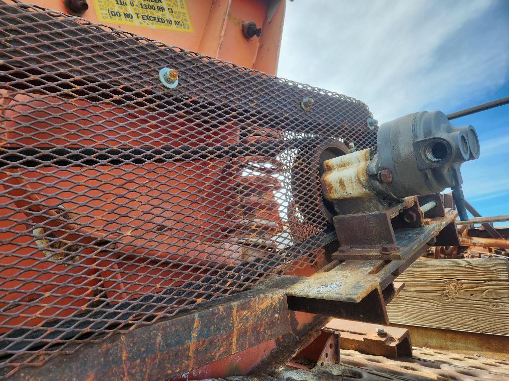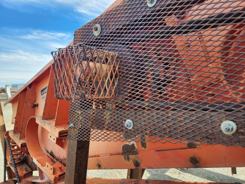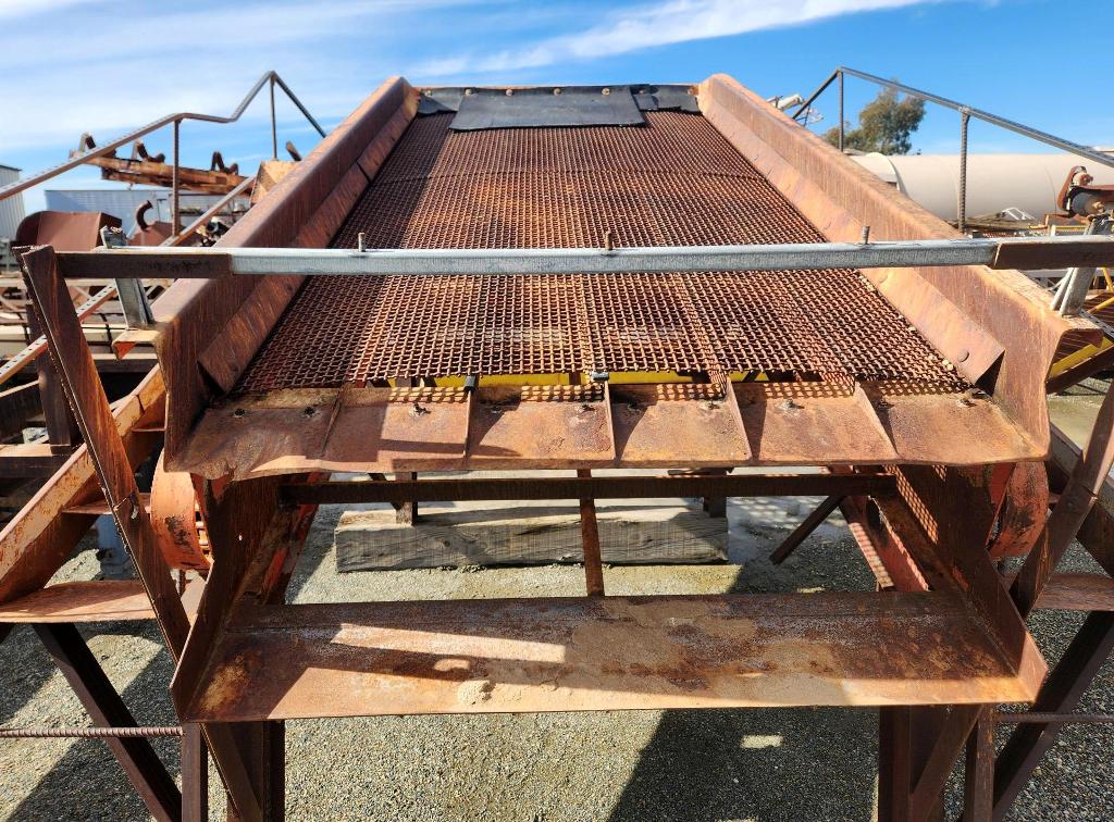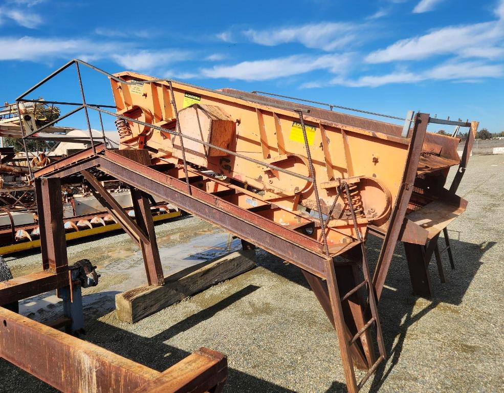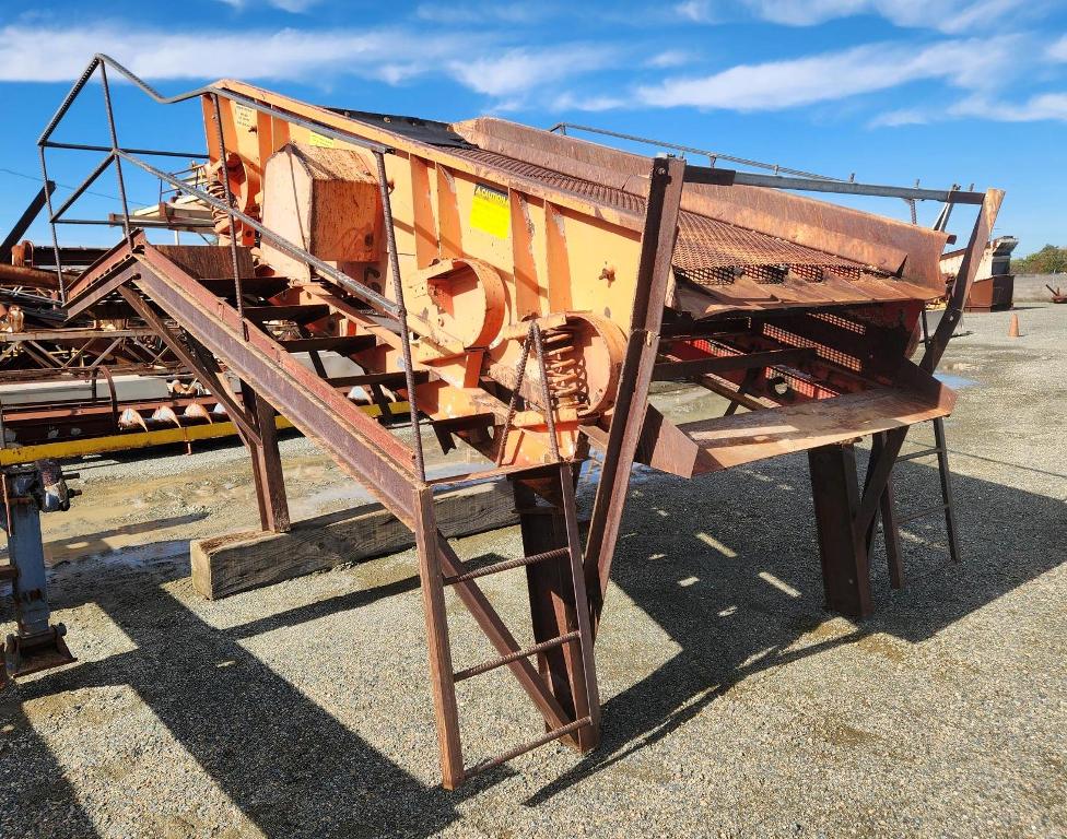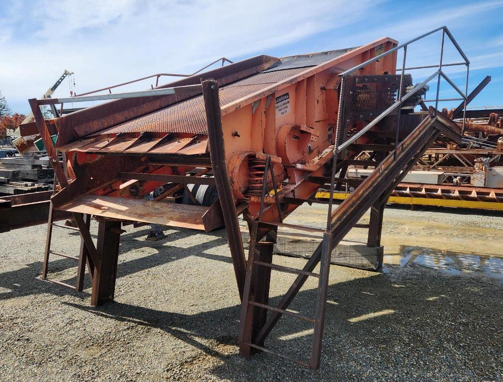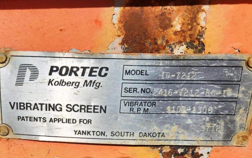 (1) – one – KOLBERG 6’ wide x 12’ long Two Deck Incline Vibrating Screen, single crown top screen deck with side tensioned clamp rails, end tensioned bottom deck, 1100-1300 rpm single shaft two roller bearing grease lubricated vibrator assembly with exterior adjustable counterweights, hydraulic motor with V-belt drive & guard, partial support stand with walkways on three sides. Model 1D-7212; S/N 2416-7212-86-1D; Date of Mfr: 1986. Equip. #E-4002-370.