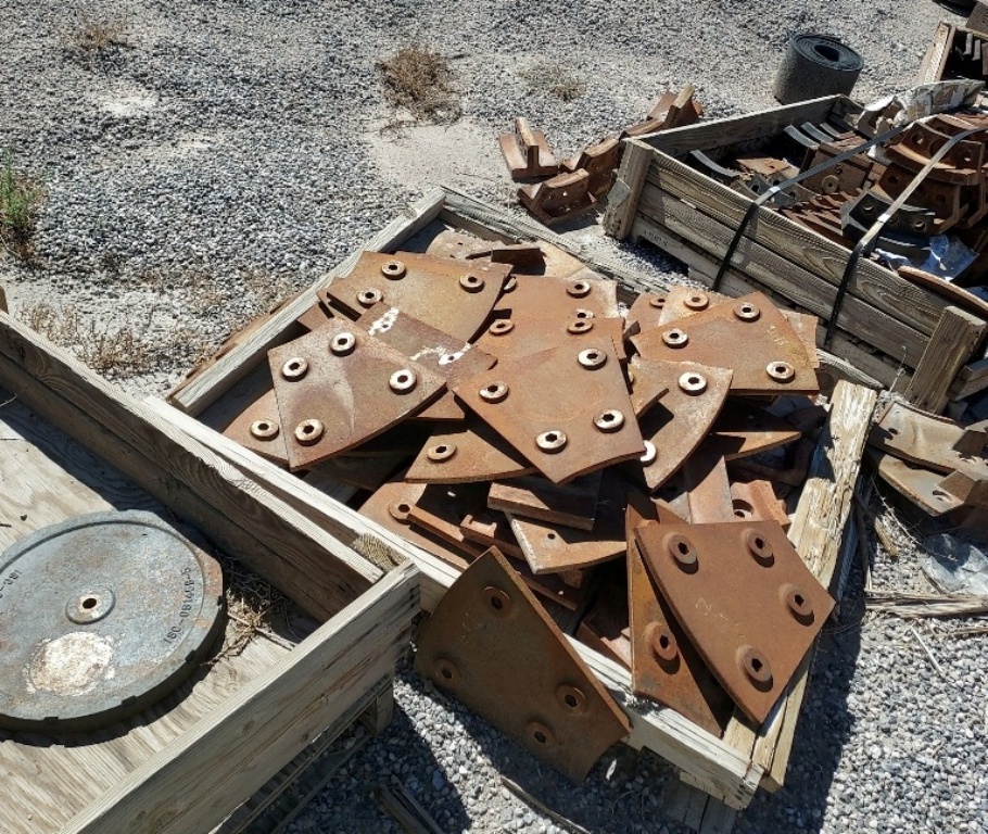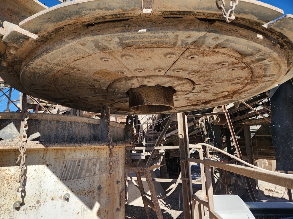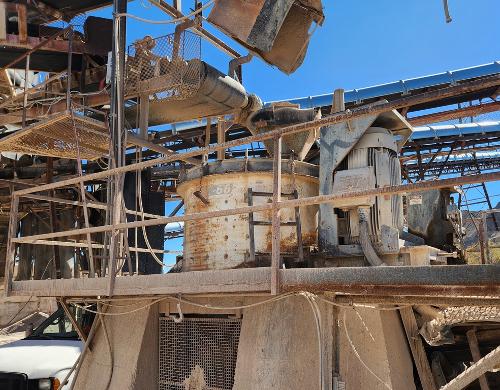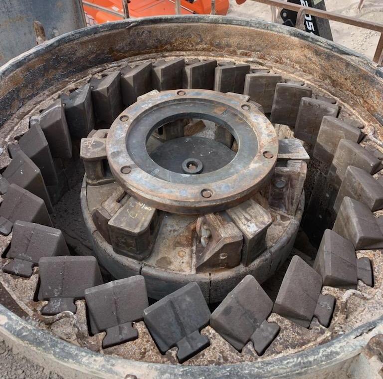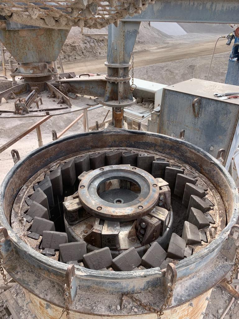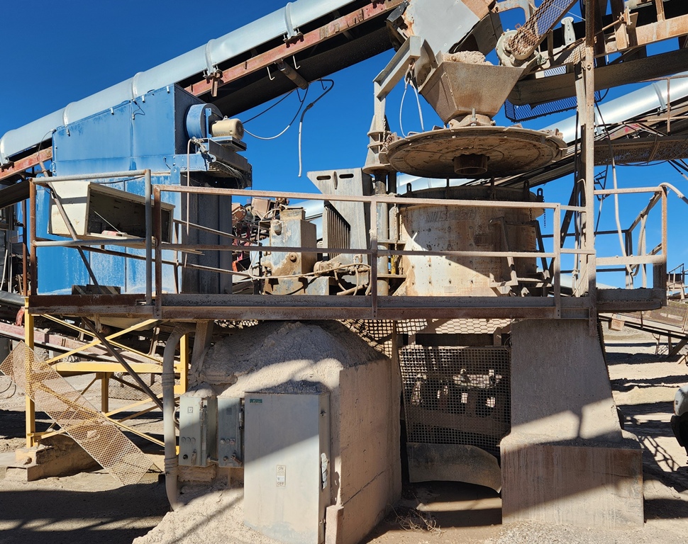 (1) – one – Impact Service Corporation (ISC) Model 66 Vertical Shaft Impact Crusher, rock on steel design with 60 Series 6-shoe 33” diameter impeller table with cast steel wear shoes, 24 count anvil ring, new wear shoes and anvils installed, sectioned steel lid liners, hydraulic lid lifter, adjustable feed tube with extension, 250 h.p. 1185 RPM electric motor with V-Belt drive with guard, electric motor starter components. Steel support base with walkways, no support legs. S/N 66-122. Date of Mfr. 1997. Purchase includes +/- $15,000 worth of new spare wear parts.